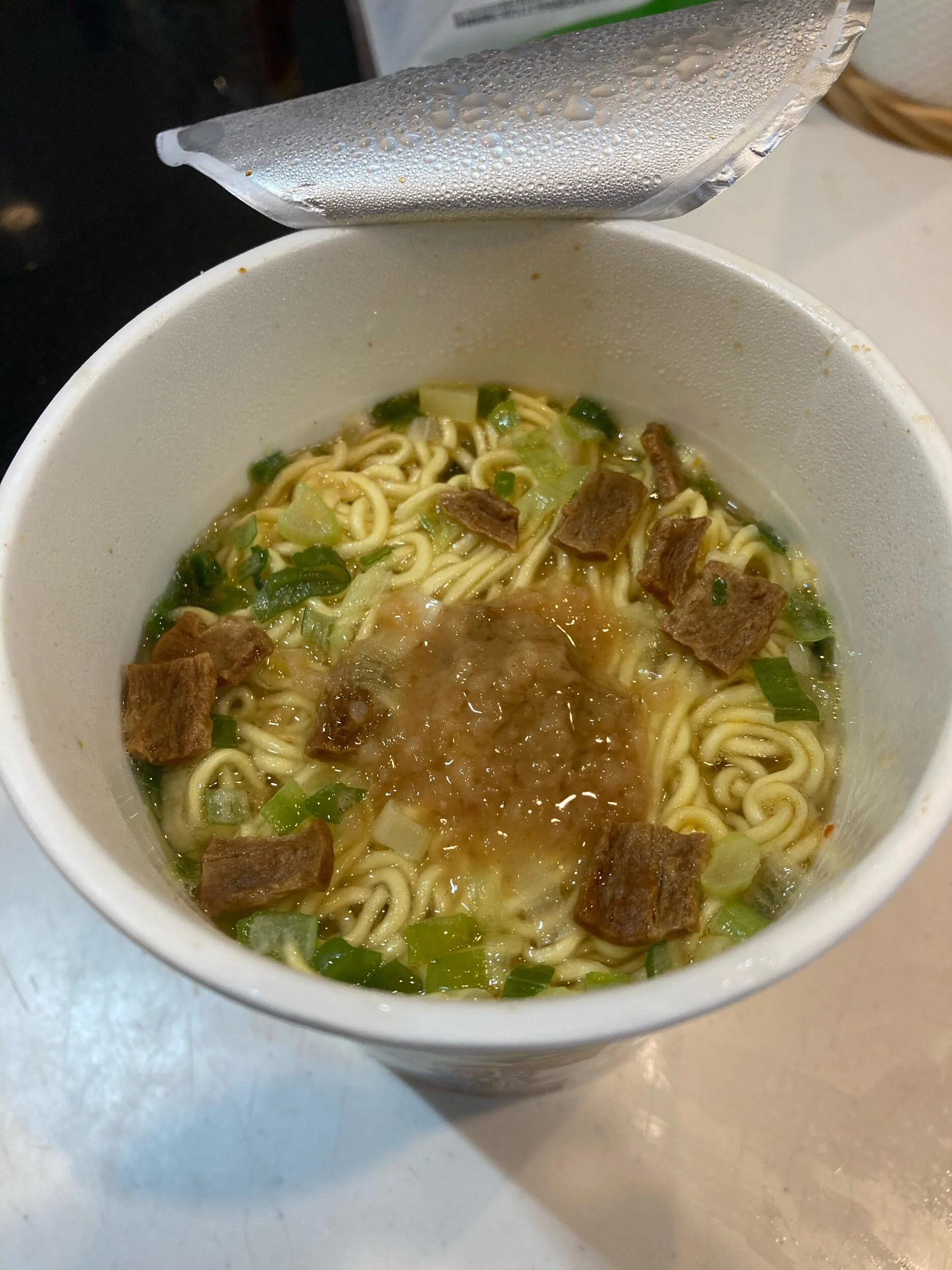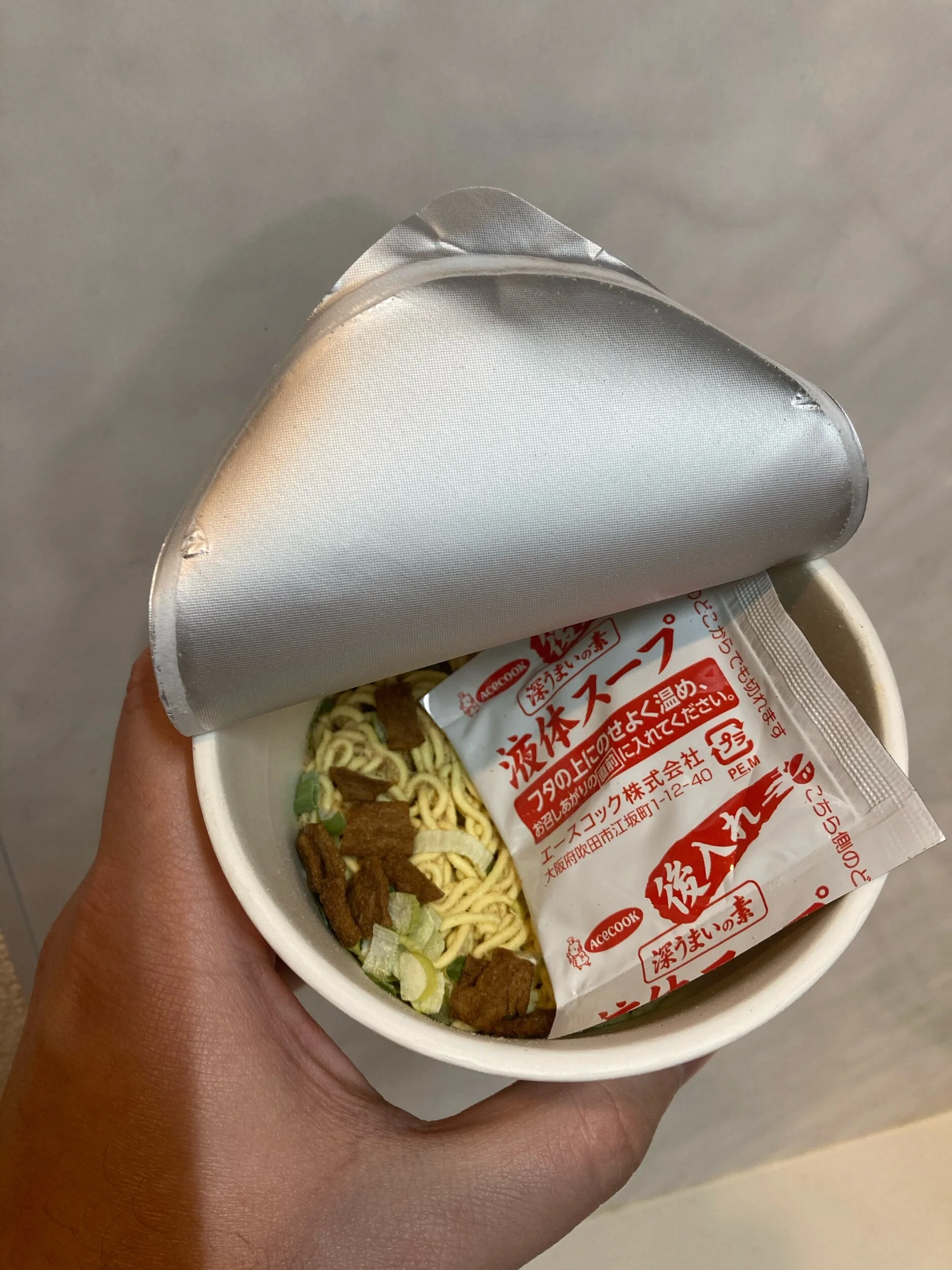 The cup comes with noodles already coated in soup powered. Additionally there’s a sachet with the pork back fat.
